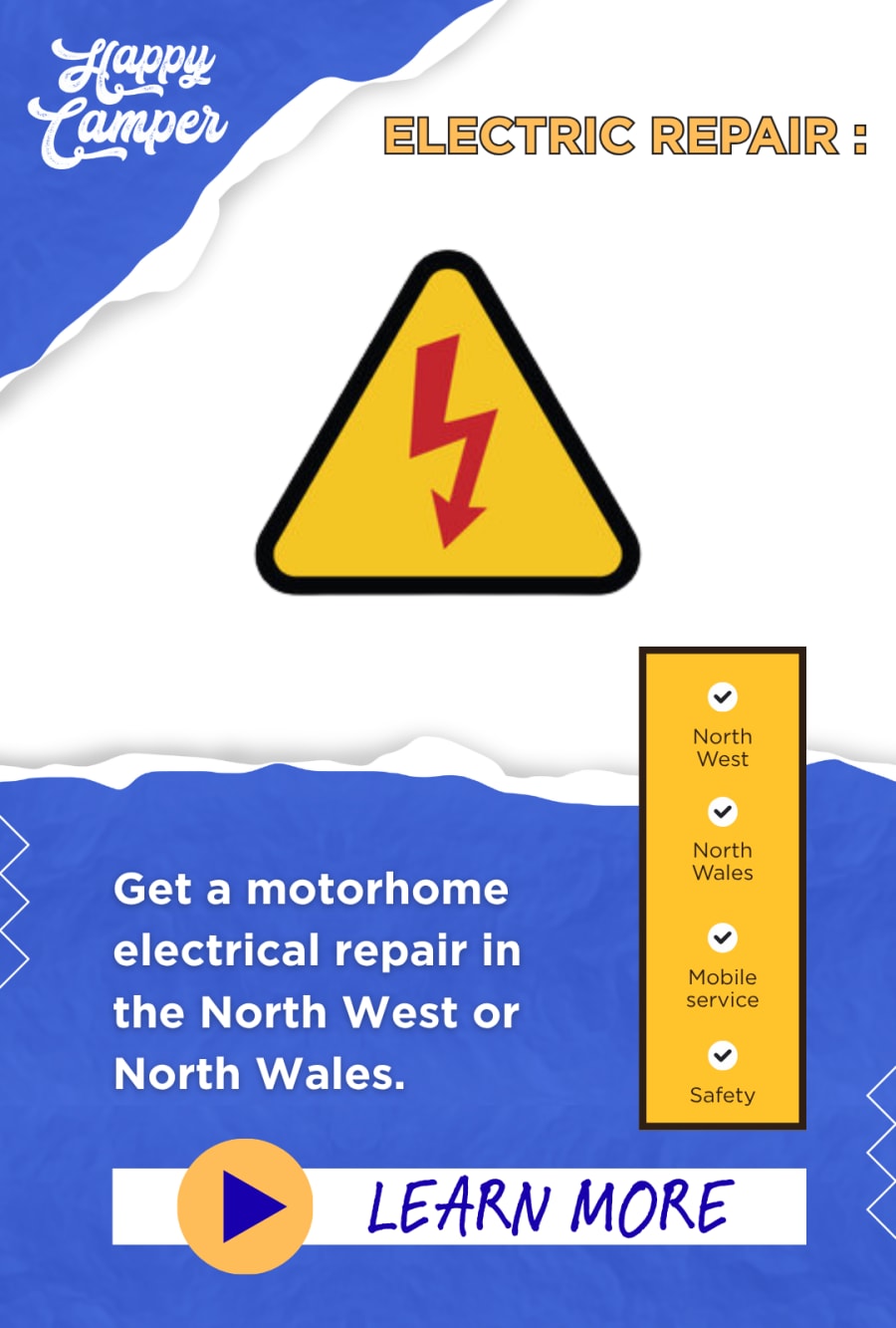 If your motorhome has developed an electrical fault we can help. Call The Happy Camper Store. There is nothing worse than your electrical system failing when you are trying to use your motorhome. With The Happy camper Store, we can assist you today. With our same day mobile services getting your motorhome electrical system sorted is exactly what we do! We can attend to you whilst you are on holiday no matter where you are in the North West or the North Wales area, fault find the issue and fully repair it. With this call out you will get 1 hours labour and the call out, if we need parts or more time to repair the electrical system on your motorhome we will price this up for you and give you a fixed no obligation quote to repair it. Book your motorhome electrical repair in with us today in North Wales or the North West. We can repair any motorhome electrical systems on all types of motorhomes and booking online is simple. With this booking you will get the call out and one hours labour. Better still, if we can repair it within that time it is included in the price. We cover the entire North West, North Wales and Merseyside area.