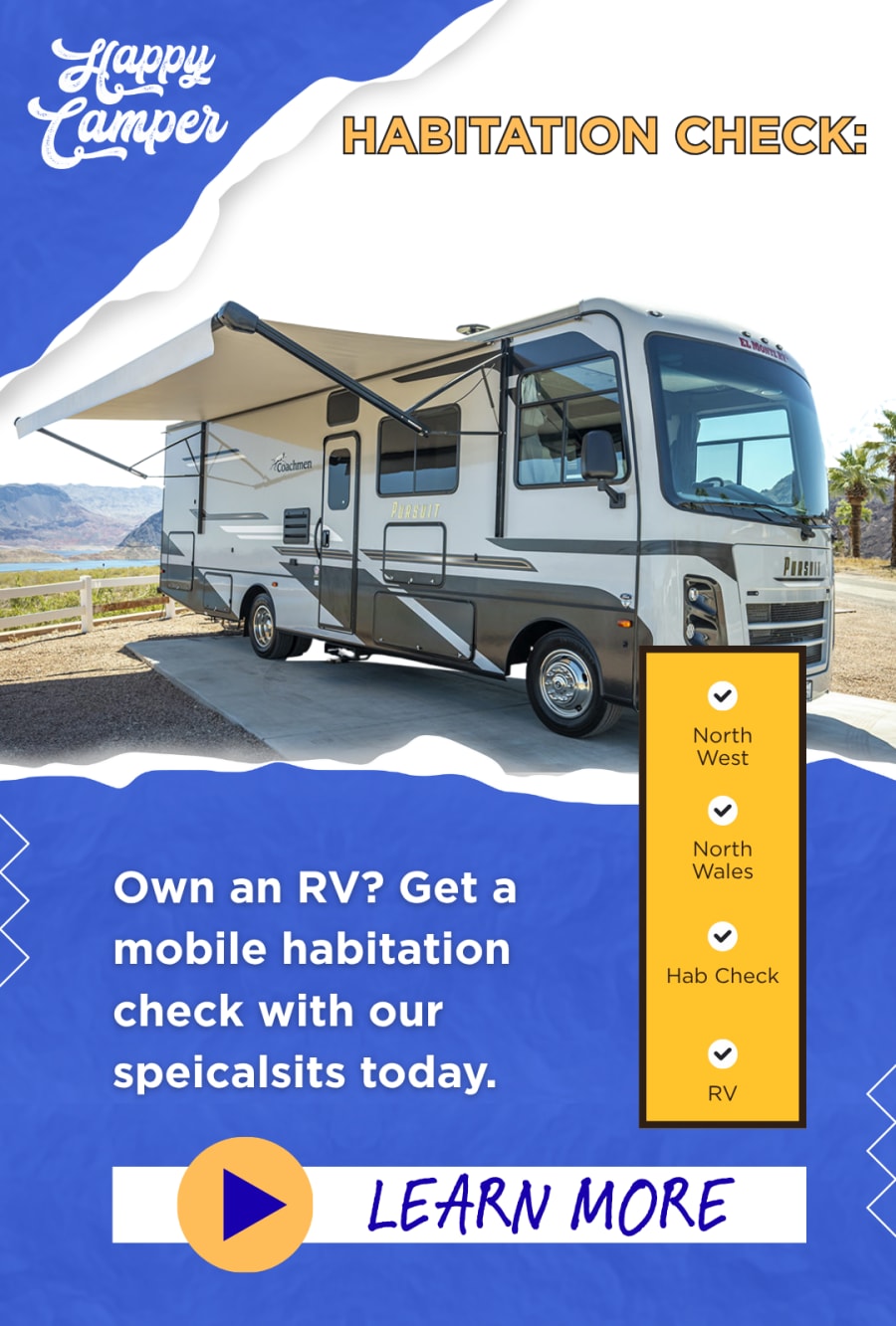 American Motorhome & RV Habitation Check in North West, North Wales We ensure the safety and functionality of your American motorhome or RV with our professional Habitation Check service. At Happy Camper, we offer thorough inspections of the living area of your RV to ensure your safety and the longevity of your RV. Book a RV habitation check online or contact us directly. WE cover the entire North West and North Wales area.