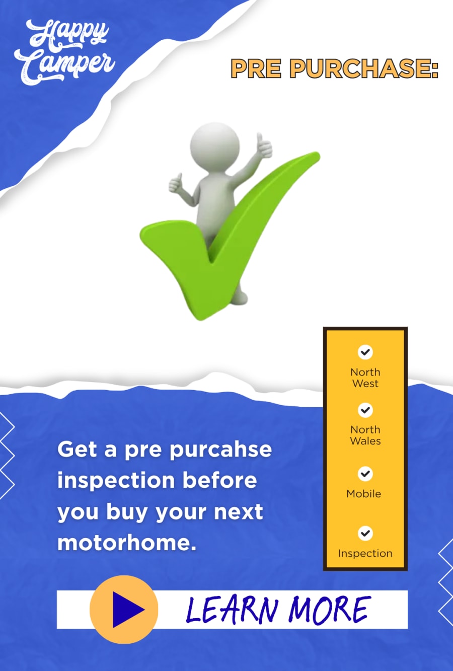 Fortunately, The happy Camper Store make it really easy for you to check on the condition of any motorhome or camper van you are intending to buy in the North West or the North Wales area. Most importantly, our service is mobile as well as garage based, so we go to wherever the motorhome is being sold from or stored at. We can get the report to you very quickly and therefore, being safe shouldn’t cause a delay in the buying process. So, complete peace of mind is just a phone call away. You should have a pre-purchase inspection carried out wherever you are buying your motorhome from, even from a dealer!