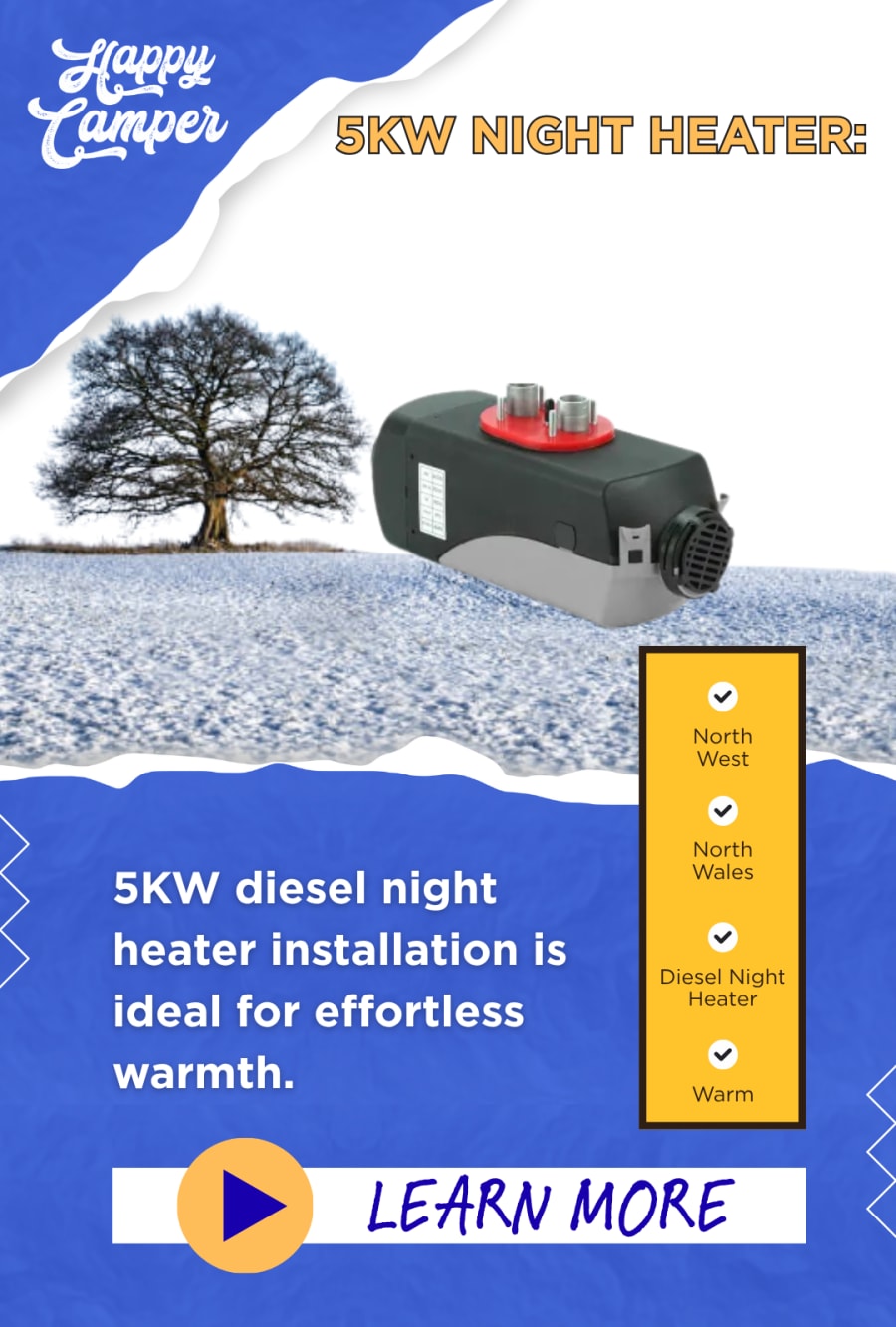 5KW Night Heater Installation North West & North Wales is just a phone call away. If you are Looking to use your larger sized motorhome or camper all year round, a 5KW night heater is the perfect solution for your caravan, campervan, motorhome, or boat. At Happy Camper, we specialise in professional 5KW night heater installation near you, ensuring you’re prepared for any weather, wherever the road, or water takes you. Book your installation online now for a quick, hassle-free installation service. or call us on 0300 124 6982.