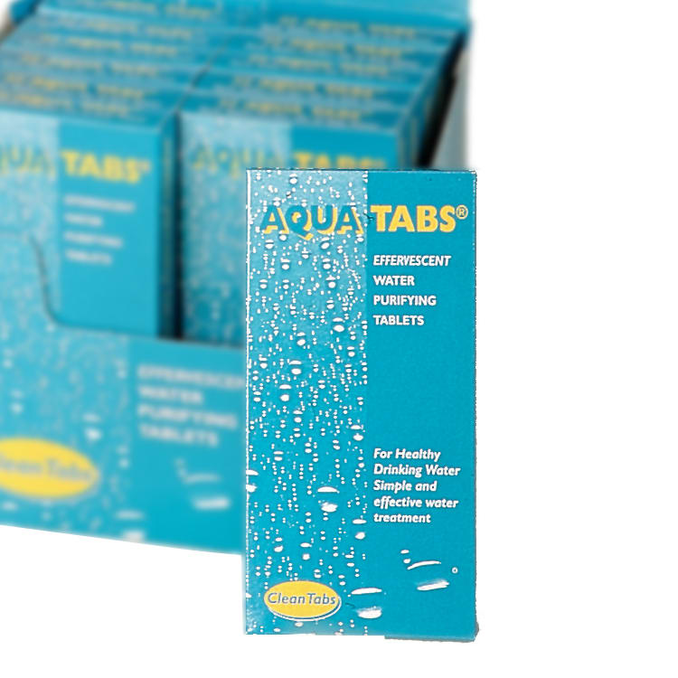 Clean Tabs Aqua Mega Water Purifying Tablet, Blue. Simply and easy to use. Each box contains 32 tabs. Rapid dissolving effervescent tablets for treating stored water. Just drop one tablet into your water and it dissolves away leaving your water purified. Each tablet purifies 25 litres of water. Each tablet is foil wrapped to remain stable for 5 years or more. The formulation contains dichloroisocyanurate an organic chlorine donor with superior disinfection capacity. They are manufactured to strict specifications to ensure an accurate dose. Simply the most convenient and easy to use method of purifying stored water.