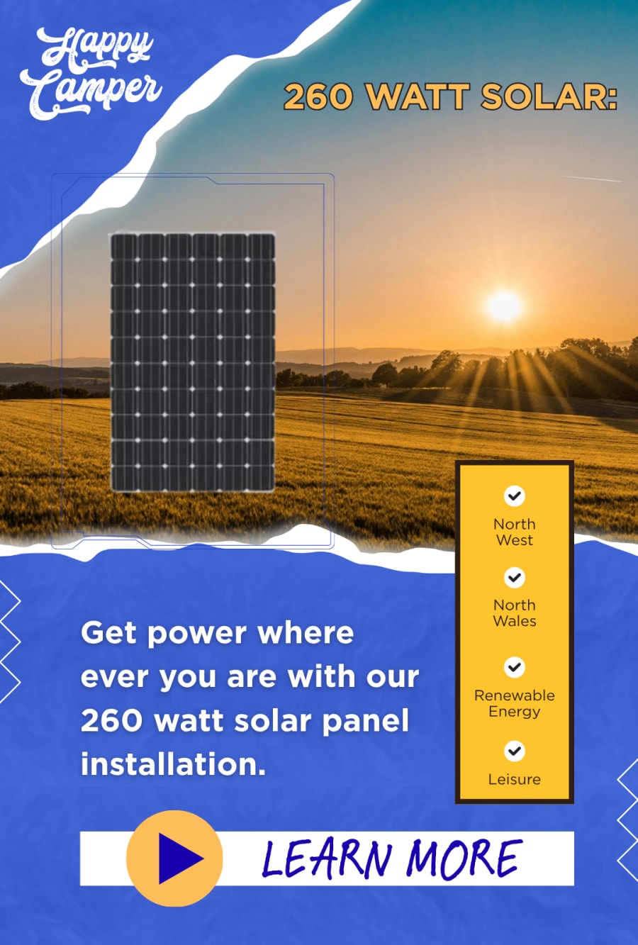 If you are looking to get a 260-watt solar panel installed on your caravan, camper or motorhome we also install this type of solar panel to canal boats and boats in the North West or North Wales area our team at The Happy Camper Store are looking forward to helping you. We offer a fully mobile solar panel installation service across the North West and North Wales area that can install your new 260-watt solar panel. The best bit is we even come to you to install your new panel. We cover the entire North West and North Wales area making our mobile solar panel fitting service not only convenient but also affordable and easy to use. We use only quality solar panels which have been tried and tested and offer a full fitting service. We fit a range of solar panels suitable for all types of caravans, motorhomes and camper vans but this particular solar panel is 260 Watts. Our price includes fitting of the new pannel If you are looking for something with more power please take a look at our other solar panels by Clicking Here. Of course, you can also give our team a call directly on 07376 440065.