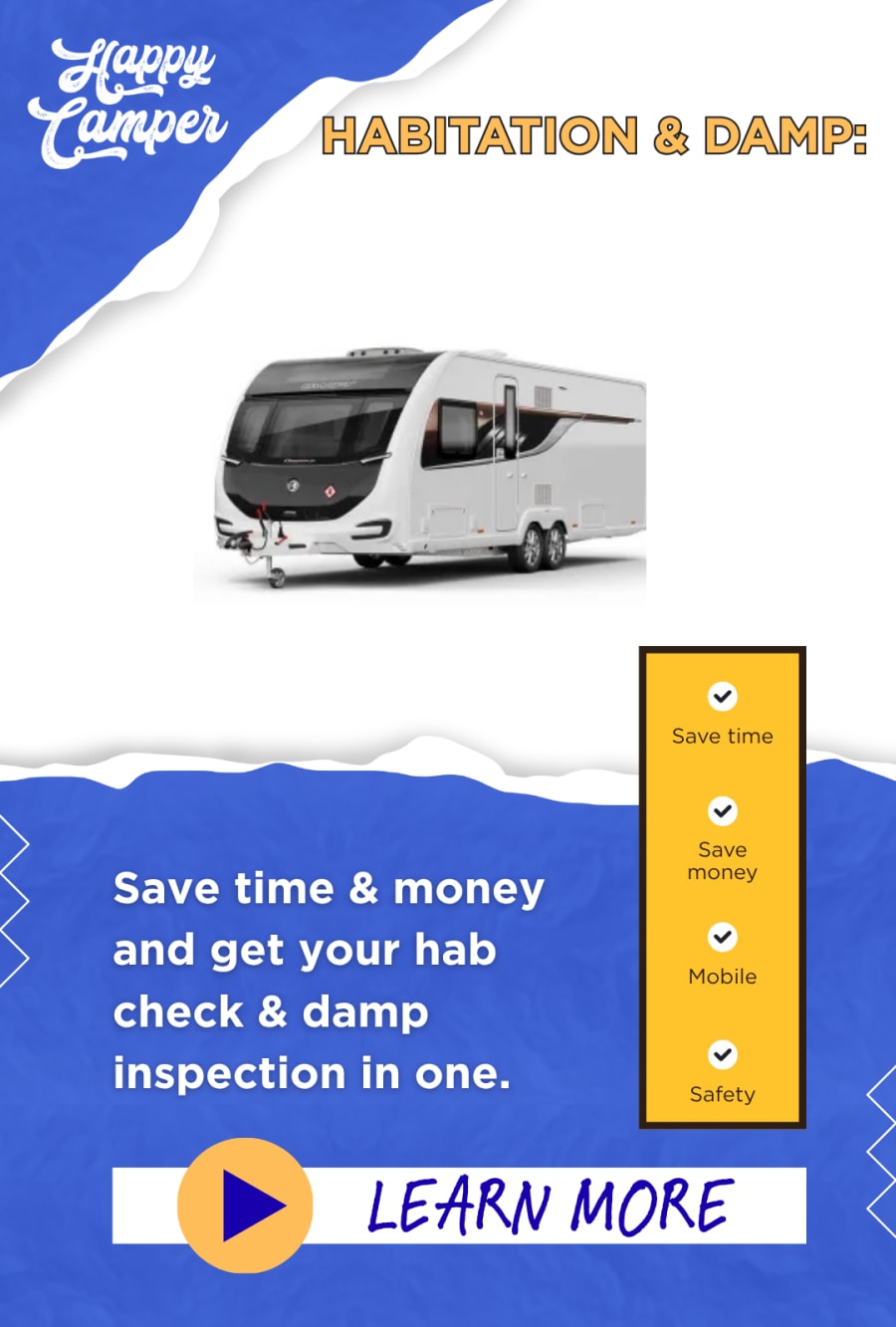 Using The Happy Camper Store for your caravan damp inspection and habitation check means your touring caravan will receive a full check over and will include a damp test with an in-depth report. The damp test is carried out using an invasive technique which is more likely to pick up any damp or ingress issues. Water ingress is by far the worst enemy of your caravan, it can cause thousands of pounds worth of damage in no time at all. A damp test can give an early warning of any damp resulting from faulty or deteriorated body joint sealant, ill fitting or damage to habitation door, windows, seals and locker frames before its all too late. The damp test typically takes around an hour and includes a full report.